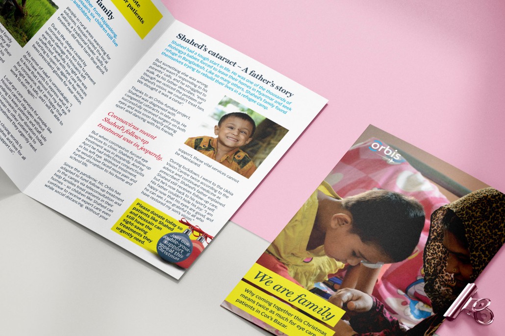 Completed for Christmas 2020, our campaign fused Orbis's essence with the holiday spirit, focusing on family, togetherness, and timeliness. Biswajit, an Orbis eye care worker who bravely continued his work despite losing his wife to COVID-19, became the authentic voice of our letter. His story provided a moving context for two beneficiary stories in the lift, seamlessly incorporating a matched funding message and Christmas theme through a recurring motif of a pair of baubles.