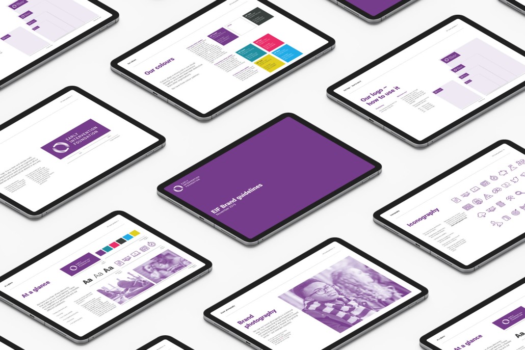 The Early Intervention Foundation had developed a brand identity, including a logo and color palette. However, the documentation was lacking, and the brand had evolved beyond its original designs. They engaged us to codify the brand—conducting an audit to assess current practices, identify what was effective, and determine areas needing improvement.