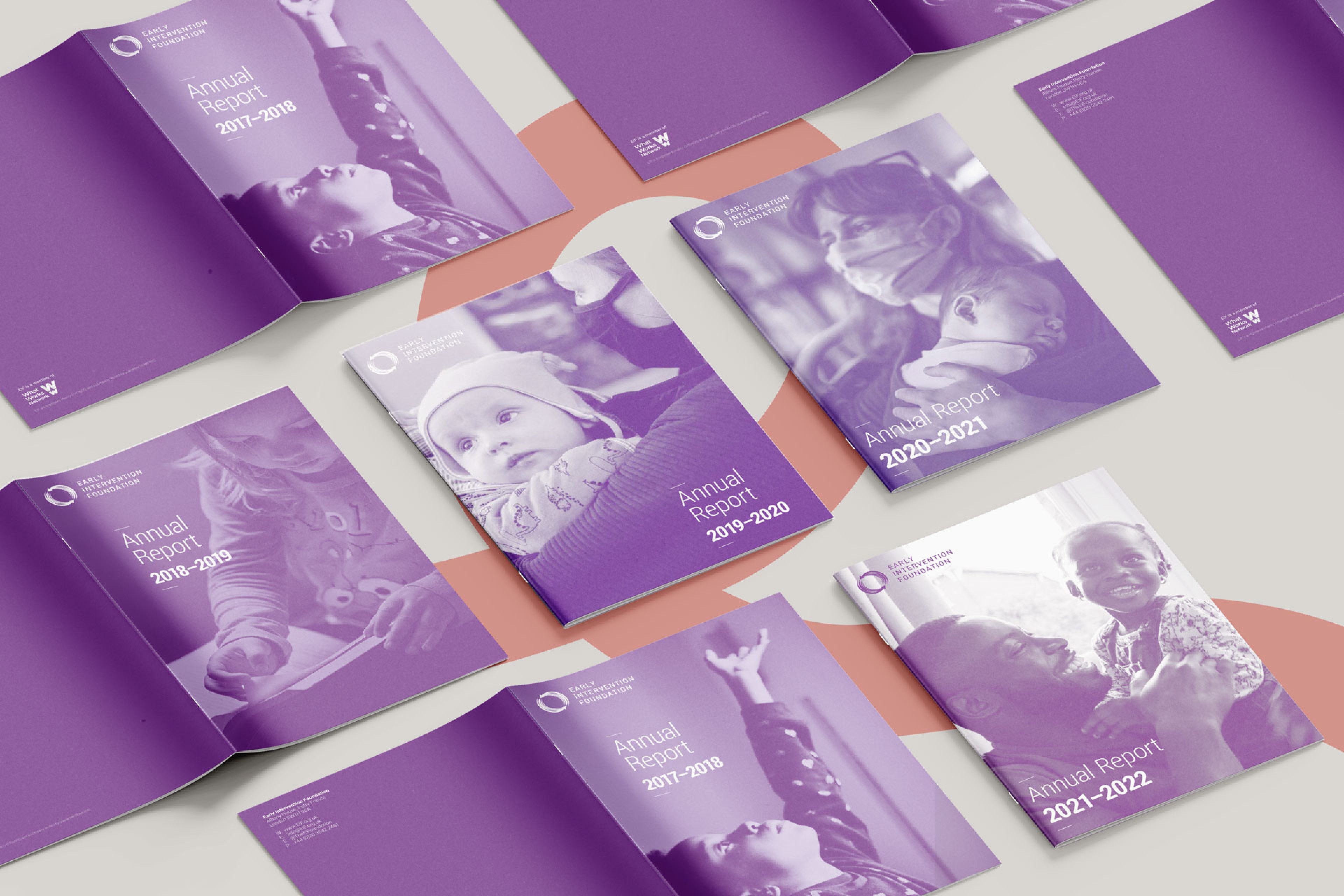 We were tasked with invigorating the Early Intervention Foundation's annual reports from 2018 to 2022. Our challenge was to reflect the organisation's detail-oriented approach, effectively showcasing achievements with limited image options. These reports targeted policymakers, public service commissioners, frontline practitioners, service providers, and those unfamiliar with the organisation.
