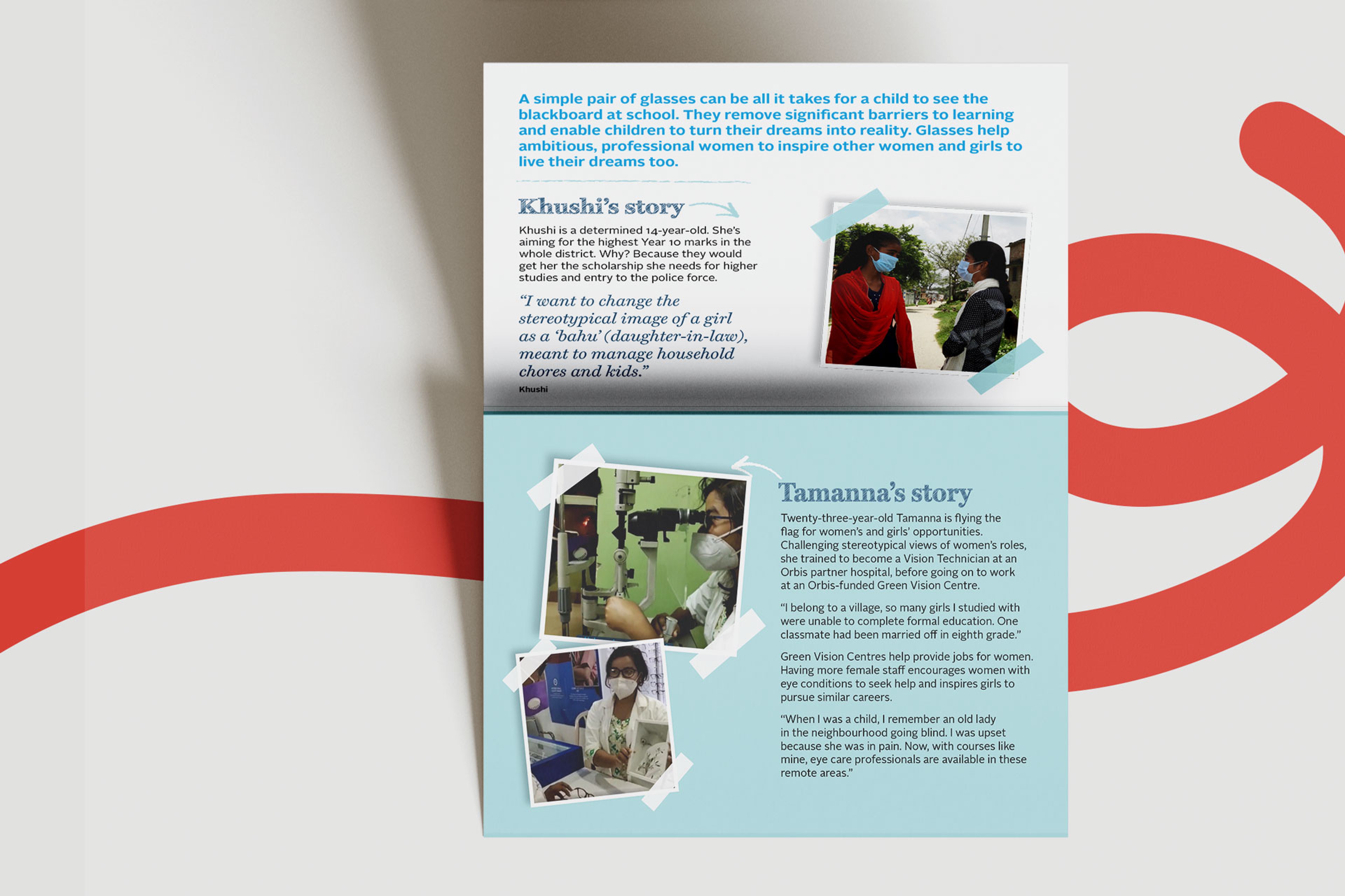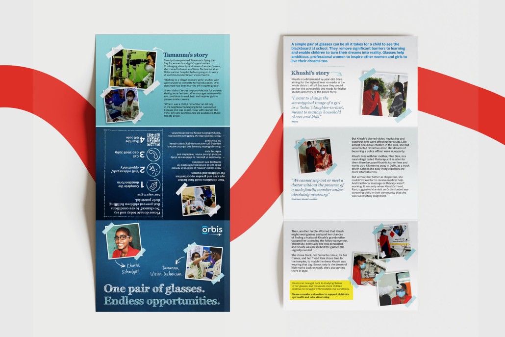 Orbis UK tasked us with developing a warm appeal for their Spring campaign, focusing on eye care access for children in India as part of their "Eye Care Everywhere" theme. The appeal would target two groups of donors—standard value (£100 or less) and mid-value (£100 to £1,000)—and would use Khushi's story to illustrate the critical need for accessible paediatric eye care. We were also asked to feature the story of Tamanna, a Vision Technician, to highlight the importance of recruiting and training women in eye health. The aim was to encourage donations without over-relying on visuals, with mid-value packs requiring a more formal tone compared to the more emotionally-driven standard value packs.