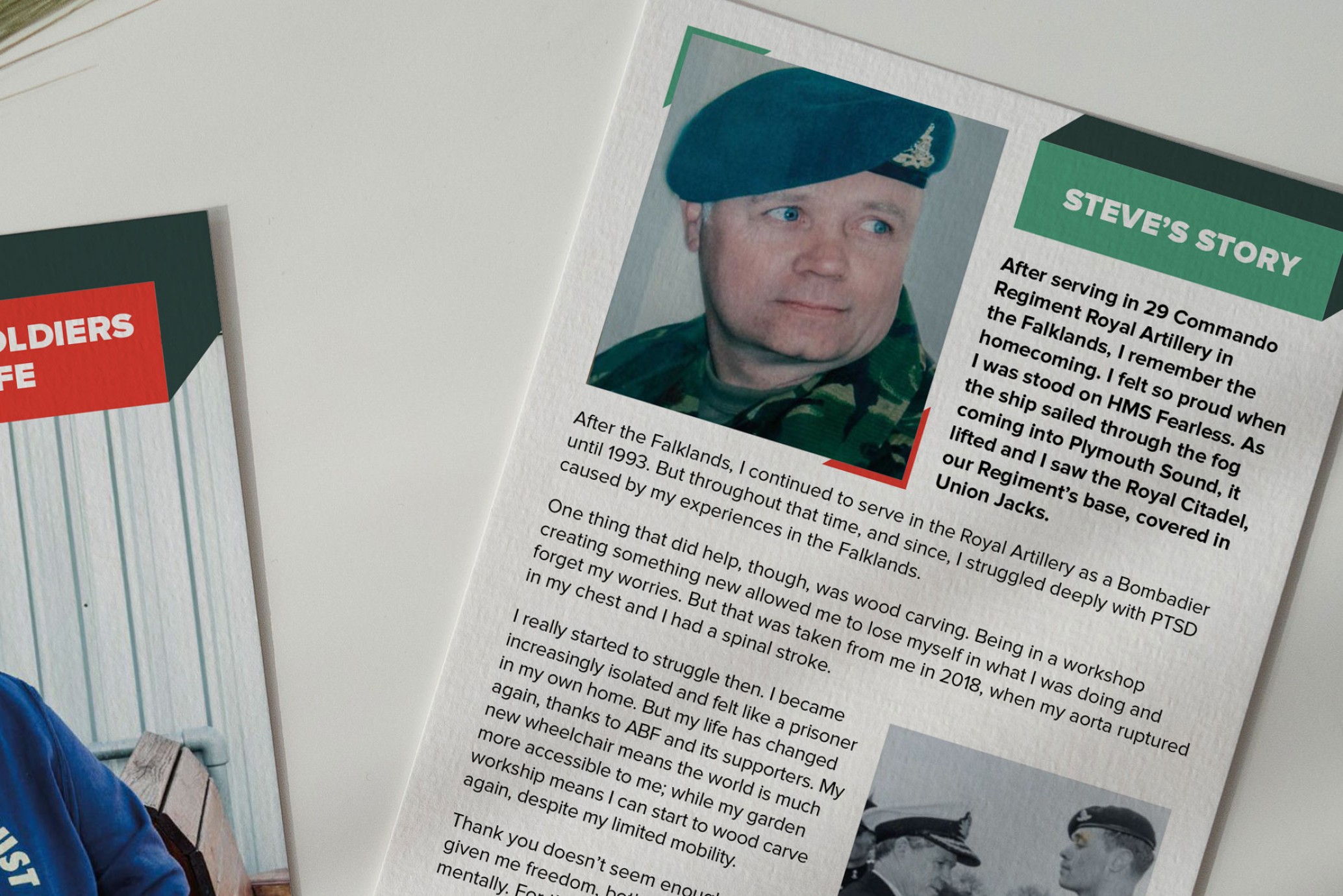 Alongside this, both the letter and accompanying leaflet shared the story of former commando Steve. These detailed the significant challenges he’s faced and how a grant for a multifunctional wheelchair and a woodcarving workshop has transformed his life.