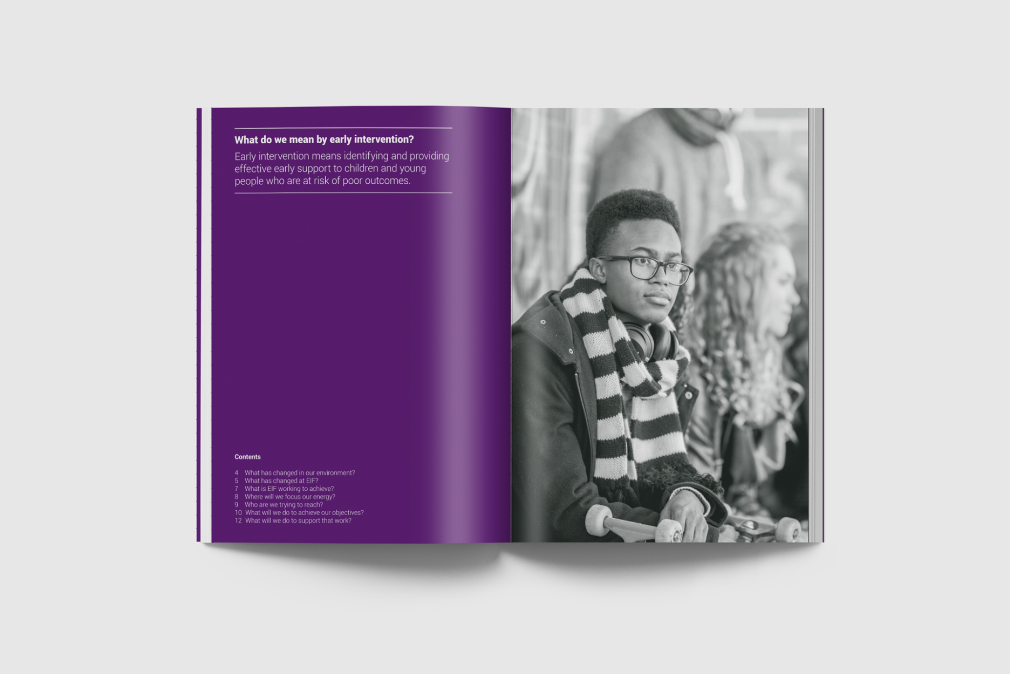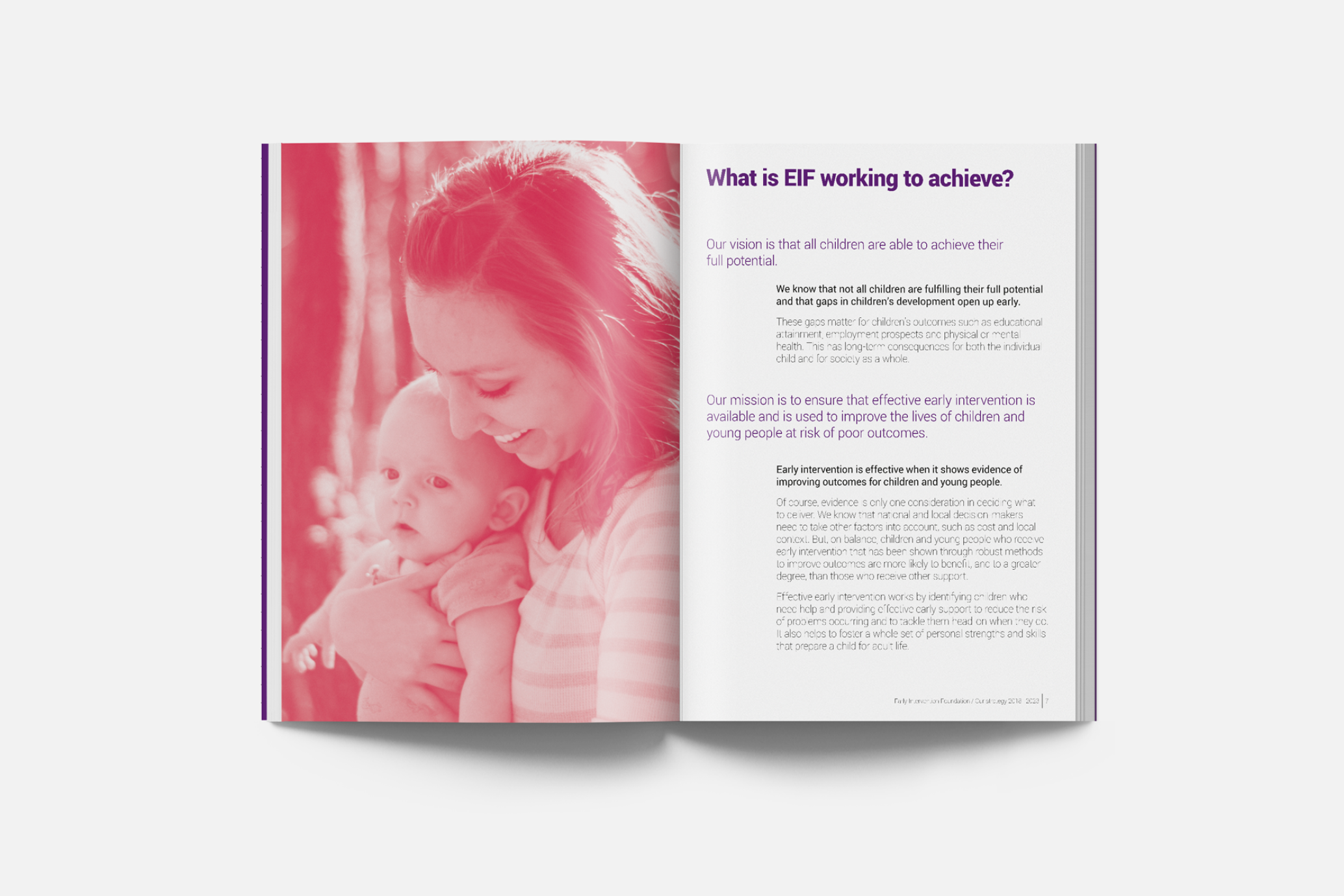 The strategic summary was seen as a lasting resource that reflected EIF's credibility and leadership in the early intervention space. The clean design allowed policymakers and practitioners to engage with the material easily, while the centre spread highlighted their core message perfectly.