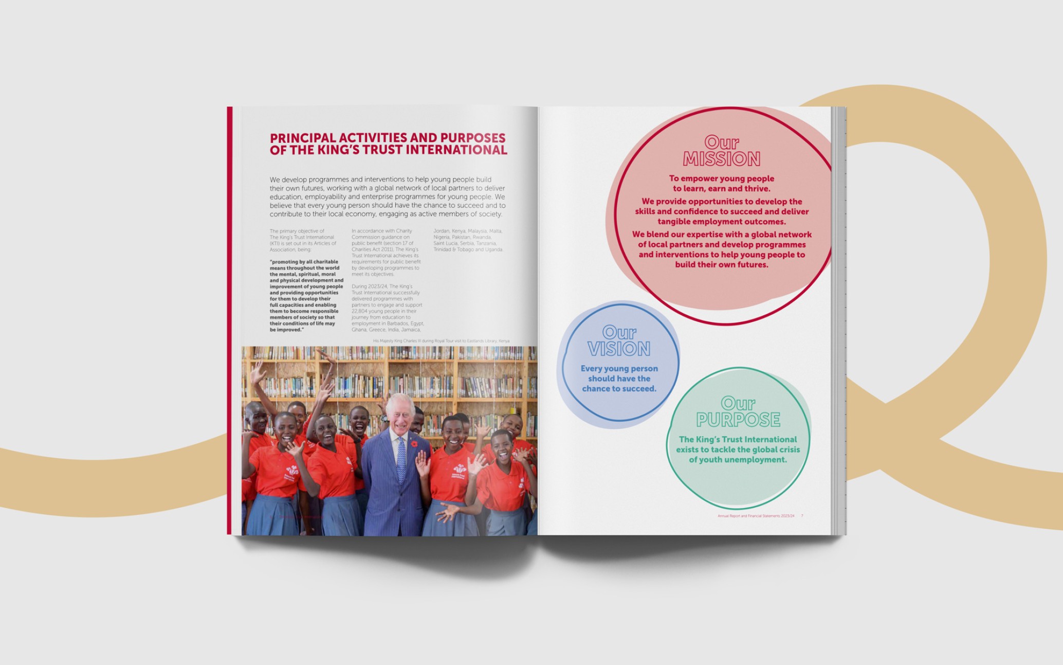 We worked closely with The King’s Trust International team to gather and interpret the key content, including financial data, case studies, and impact stories. Our design team adapted the previous report’s layout to reflect The King’s Trust’s new identity, ensuring the brand’s evolving look and feel was consistently represented. We provided copyediting and proofing services, collaborated on imagery selection, and applied the updated brand guidelines throughout the report to deliver a cohesive and engaging publication.