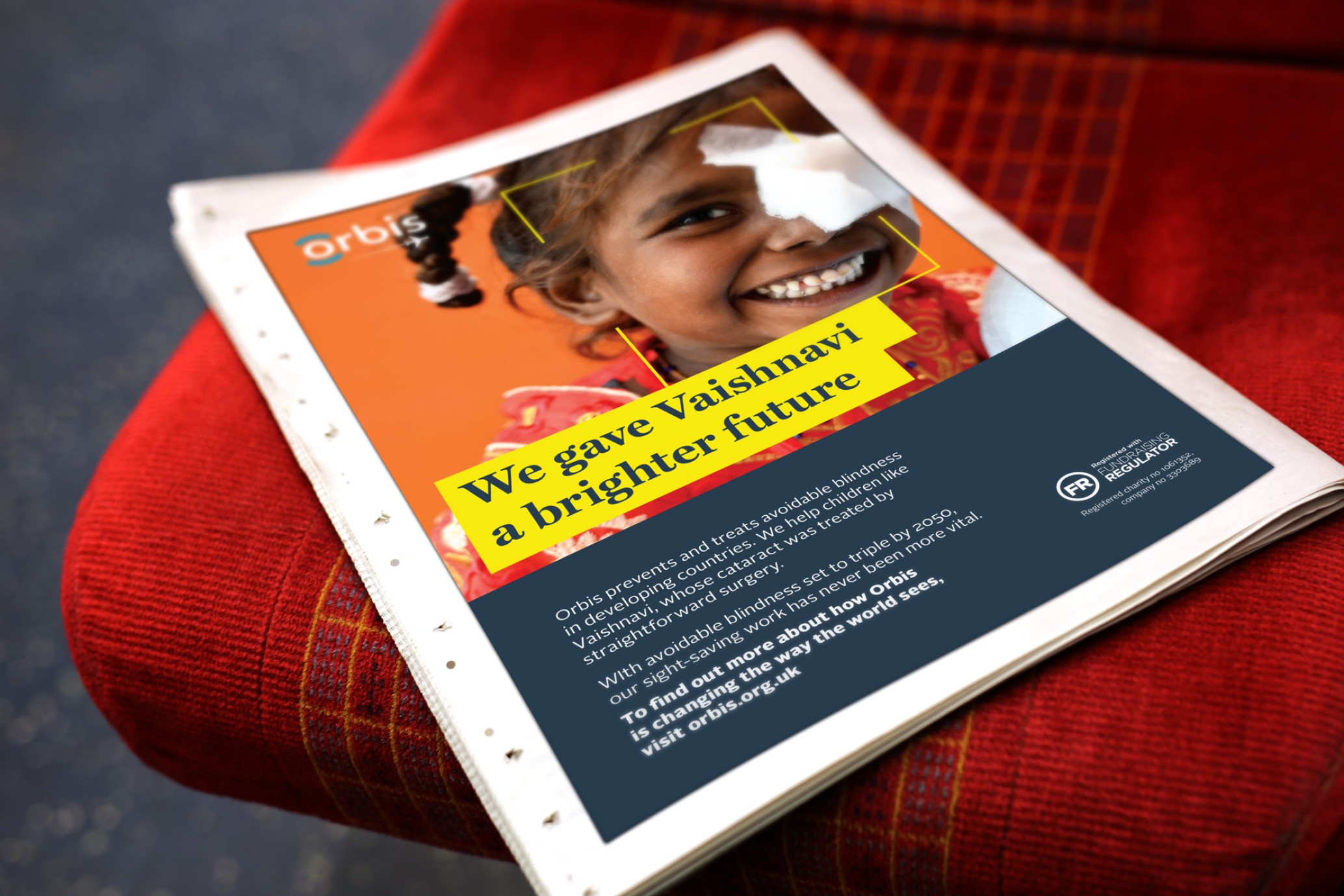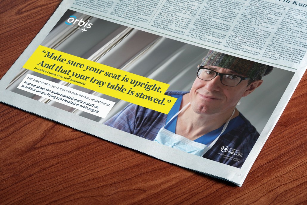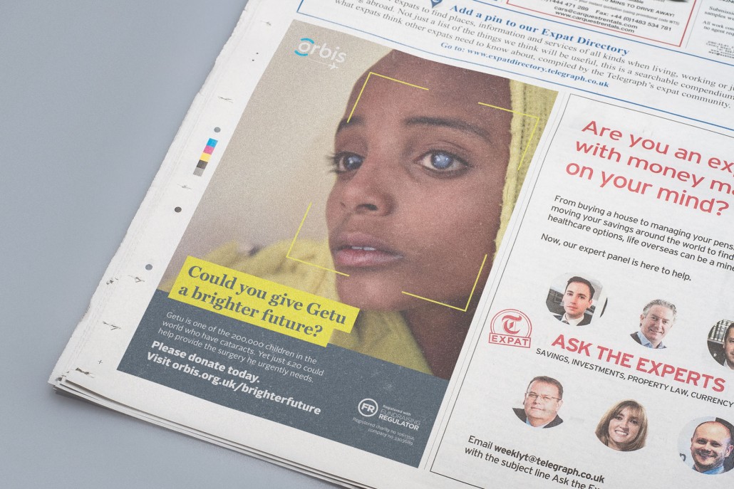 Our advertising suite featured a blend of brand and fundraising materials, encouraging readers to explore Orbis. The brand ads spotlighted the Orbis Flying Eye Hospital and the profound impact of cataract surgeries. In fundraising ads, we specifically addressed child cataracts, intertwining compelling statistics with a clear call to action. Throughout the suite, our language and imagery consistently emphasised Orbis's unique position in both ophthalmology and aviation, conveying themes of hope, dignity, and expertise.