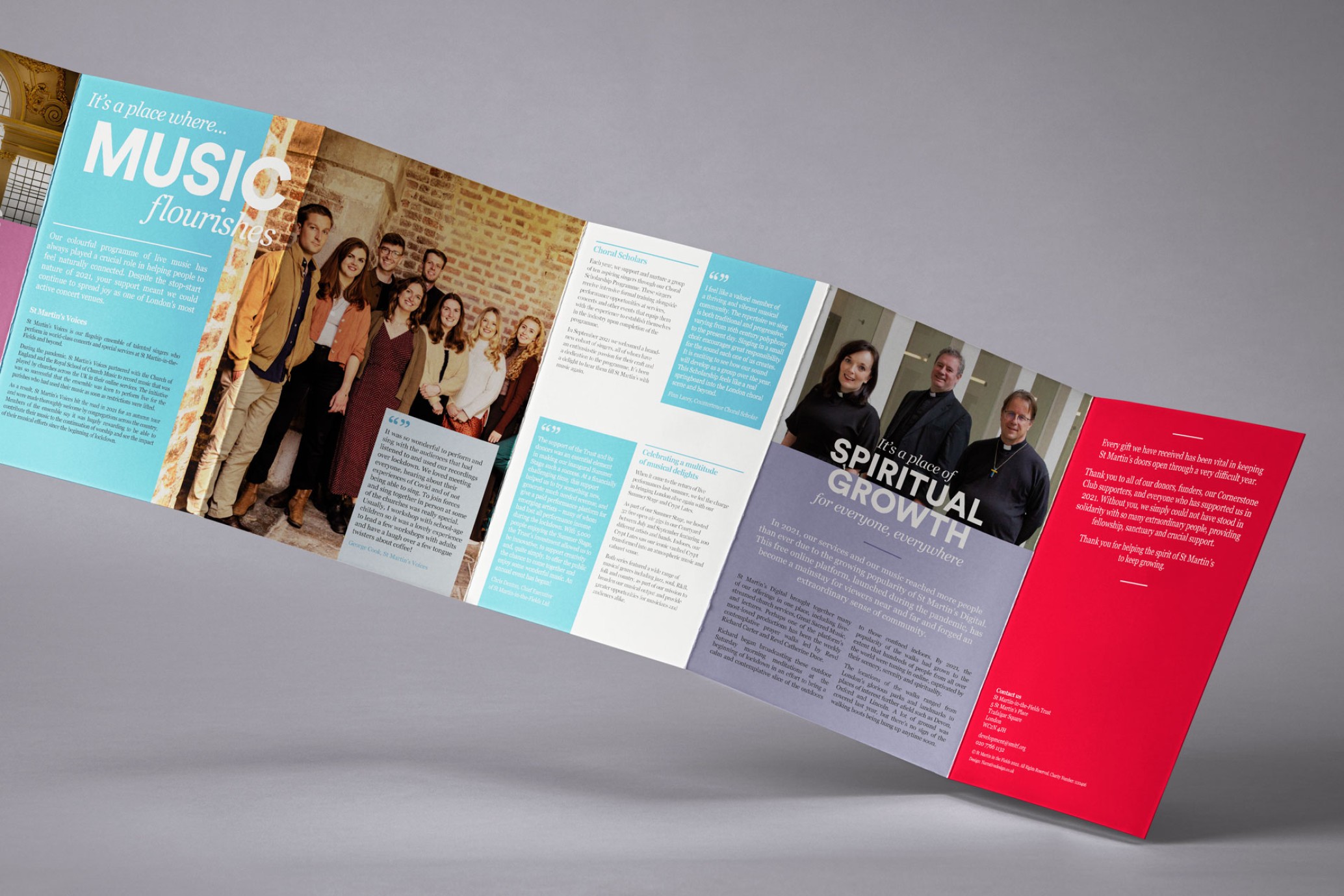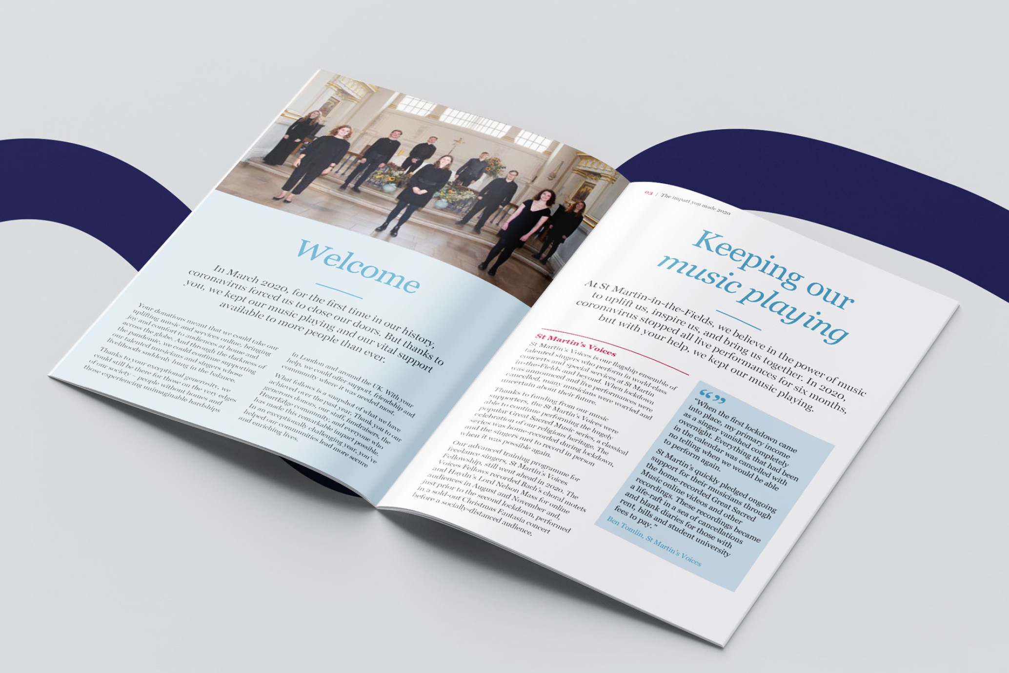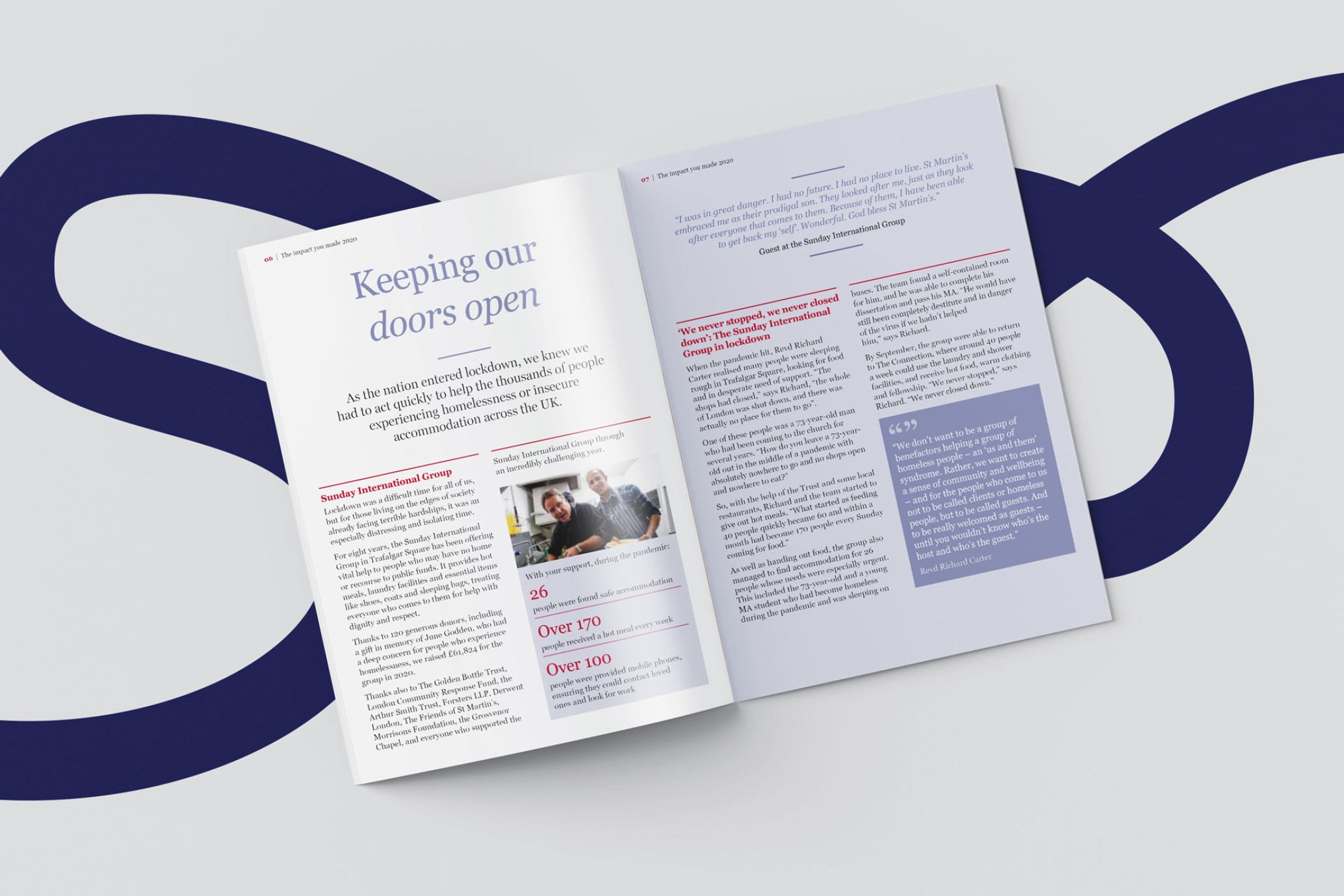 Over a three-year period, St Martin-in-the-Fields Trust asked us to produce annual donor impact reports. Each report needed to demonstrate the impact of donor contributions for the previous year, with a focus on their key pillars of music, faith, and support for vulnerable individuals. The reports were designed to thank donors, illustrate how their gifts were used, and reinforce their importance in sustaining the Trust’s vital work. Each edition included a segmented cover letter, stories of those helped, and clear financial highlights to inspire continued support.