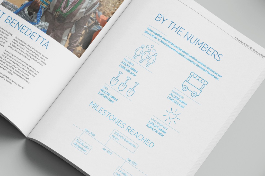 In response to the Hand in Hand rebrand in 2014, our team undertook the task of revamping their annual reports and crafting a timeless visual identity. This involved strategic deliberation on integrating the new colour scheme, image selection, and defining a cohesive style for icons and infographics, ensuring enduring relevance.