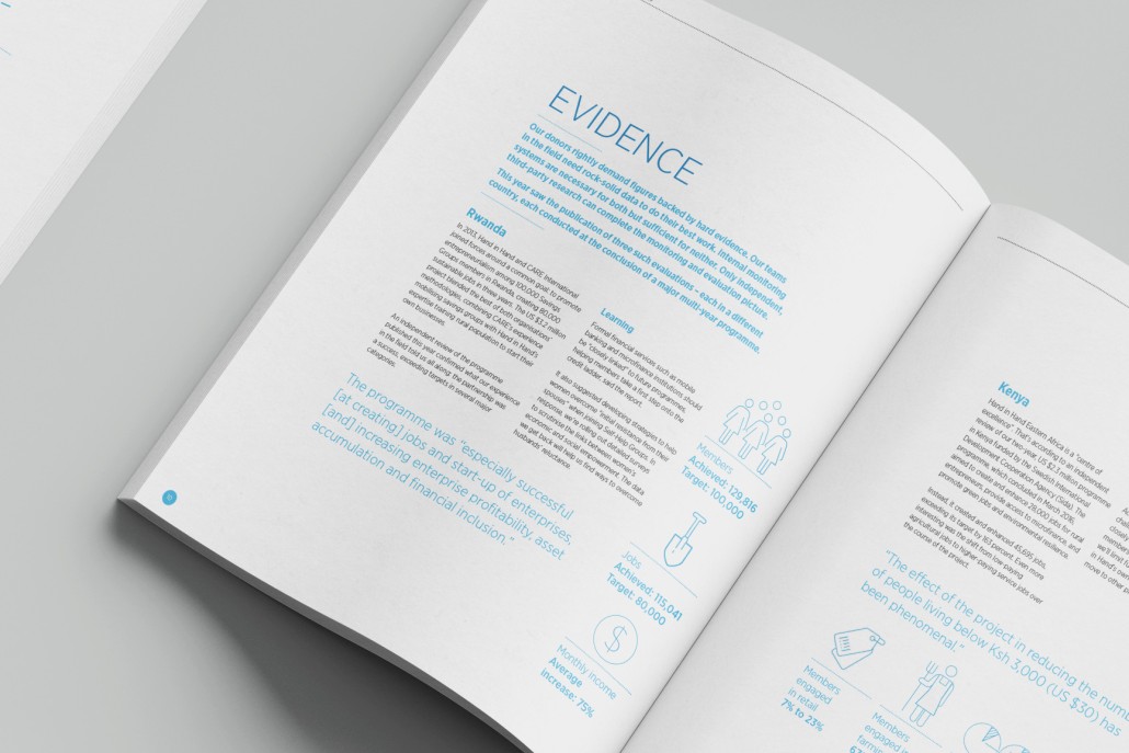 Before revamping the annual reports post the 2014 Hand in Hand rebrand, we delved into the organisation's history to ensure a fitting transition. Opting for a bold, image-centric style reflecting their brand colours, we kept internal pages clean and concise. Branded icons and simple infographics were incorporated for easy comprehension.