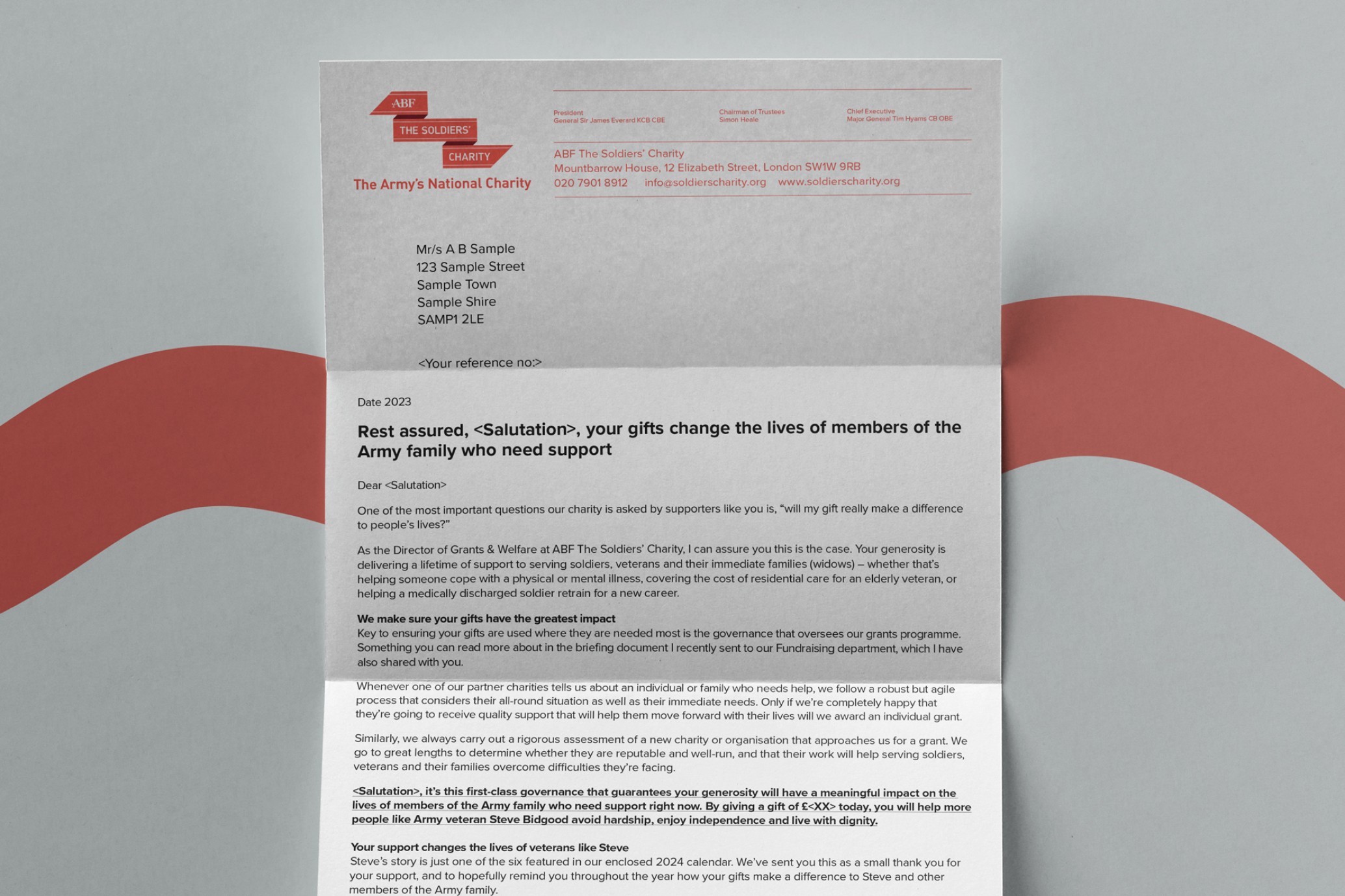 For this vital appeal, ABF asked us to create a fundraising pack that would reassure supporters that their gifts truly make a difference in the lives of former soldiers today.