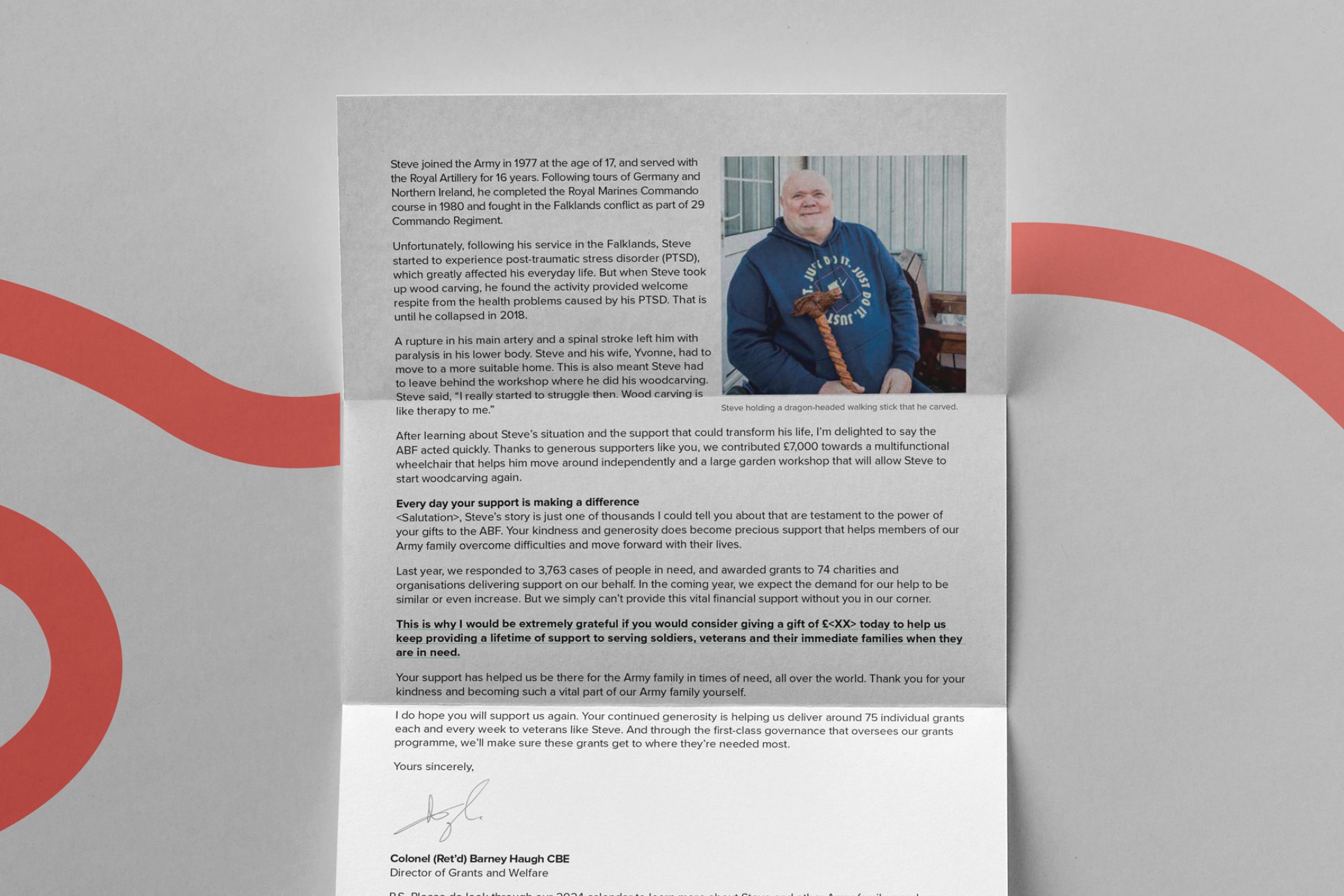 Alongside this, both the letter and accompanying leaflet shared the story of former commando Steve. These detailed the significant challenges he’s faced and how a grant for a multifunctional wheelchair and a woodcarving workshop has transformed his life.