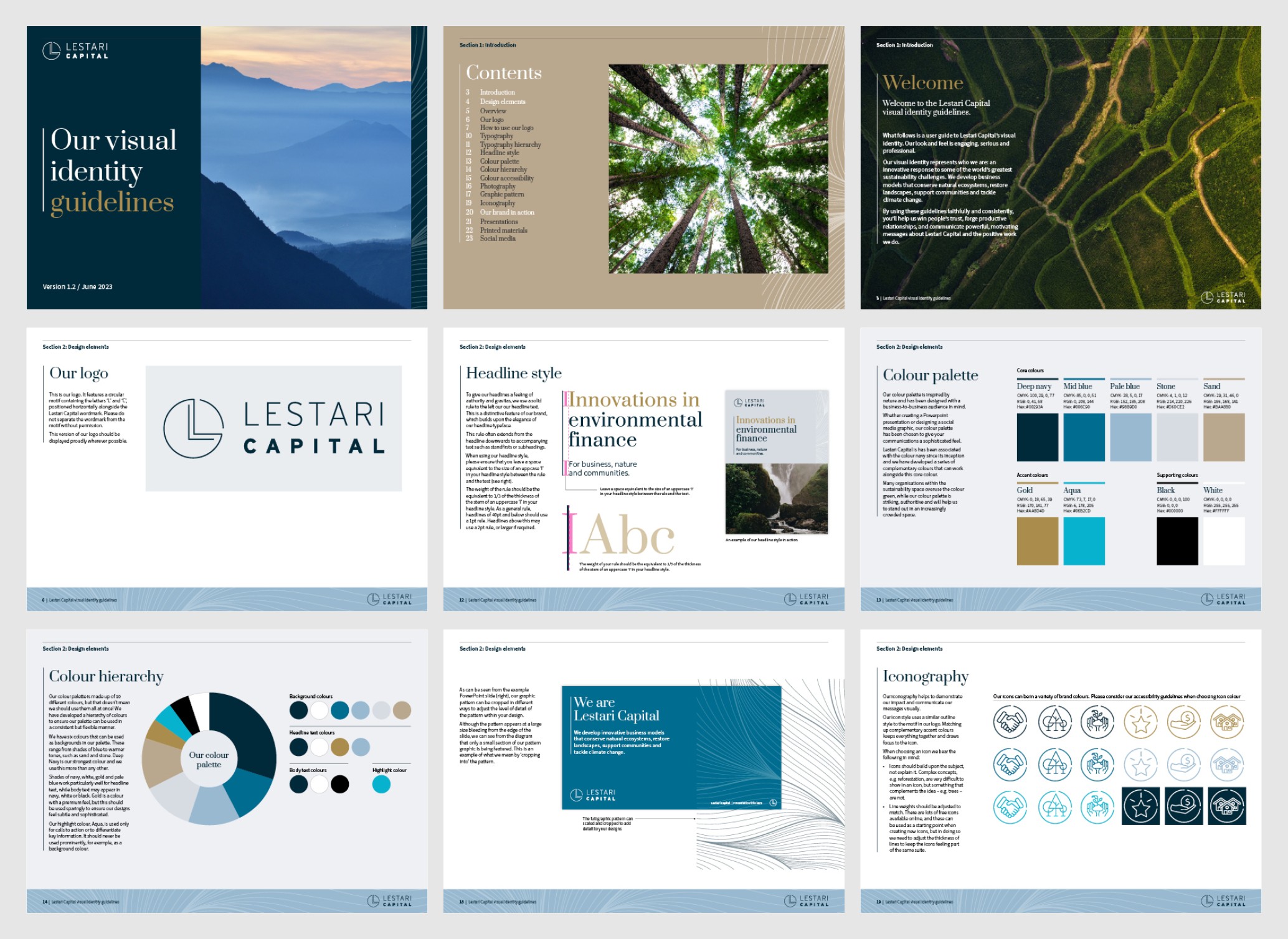 In exploring the visual identity for Lestari Capital, we aimed to infuse subtle natural elements while maintaining a global financial tone. We incorporated nature-inspired textures and patterns into the design, ensuring harmony with existing branding like Rimba Collective. The outcome is a cohesive brand identity reflecting Lestari Capital's dedication to ecosystem conservation, landscape restoration, and community support in combating climate change.
